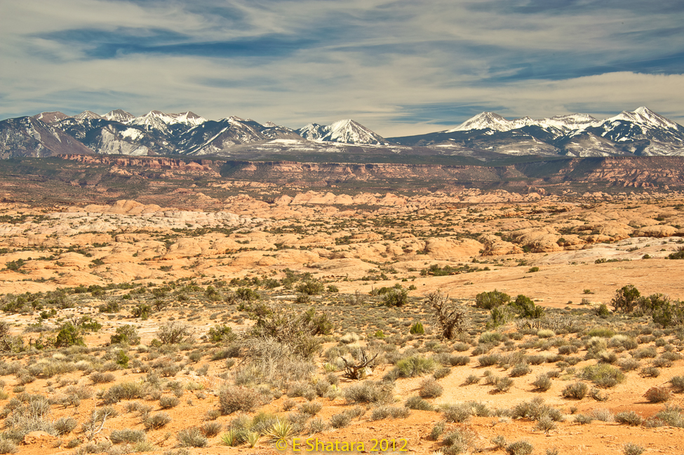 The La Sal mountains seen from the overlook across from Park Avenue. Not much snow this year.
