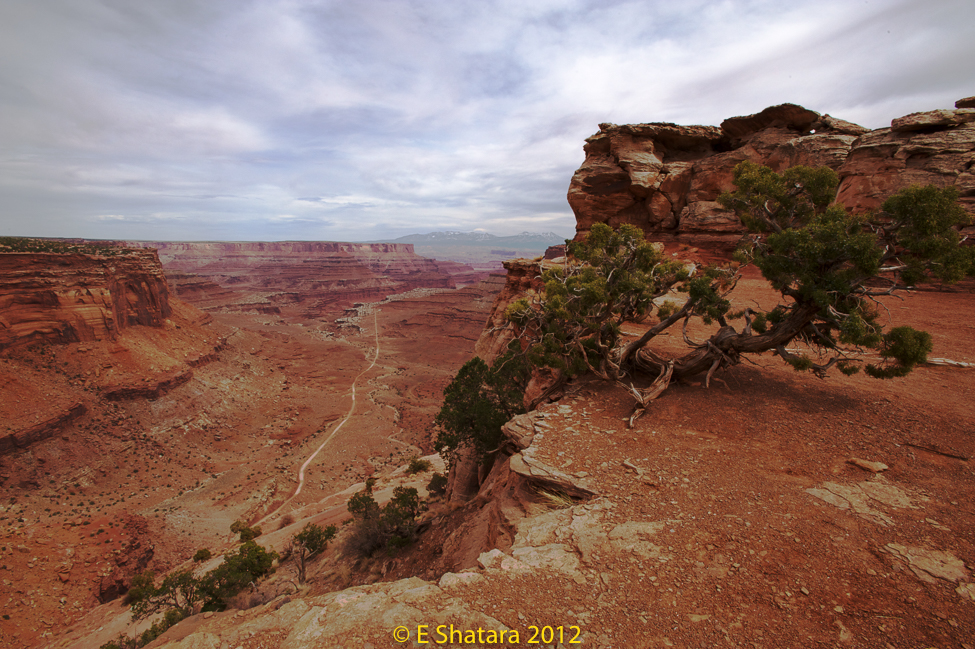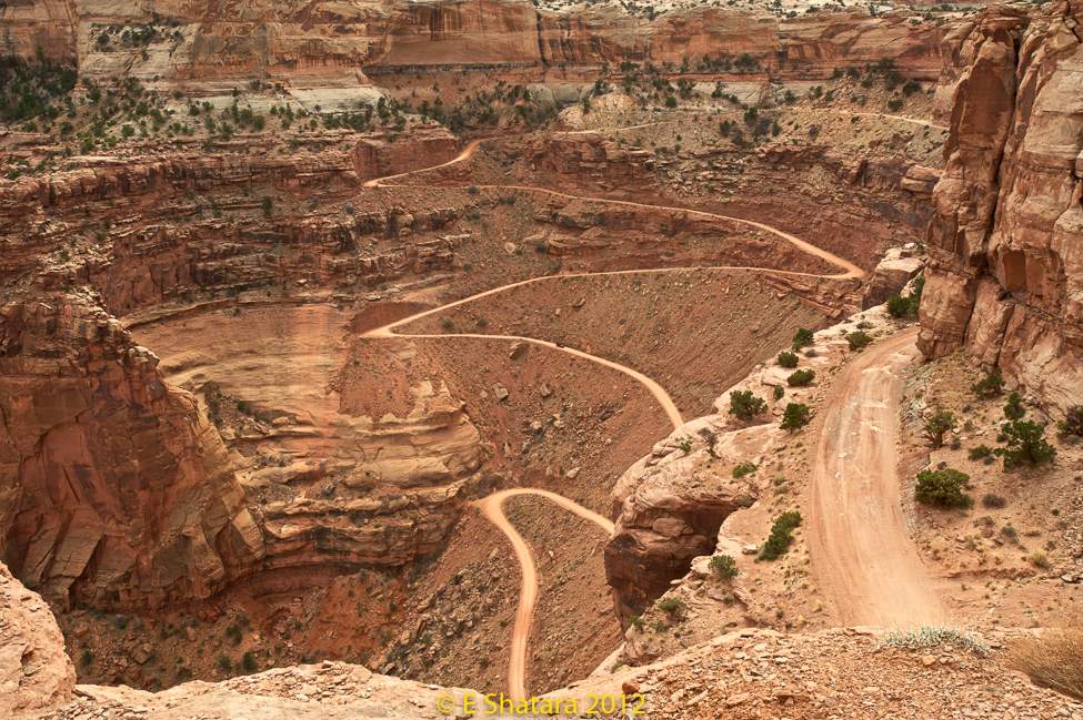 The winds were ferocious, gusting at least to 40 or 50 mph. Not the place to be! The dirt road in the canyon originates at the rim and is the Shafer Trail Road.
