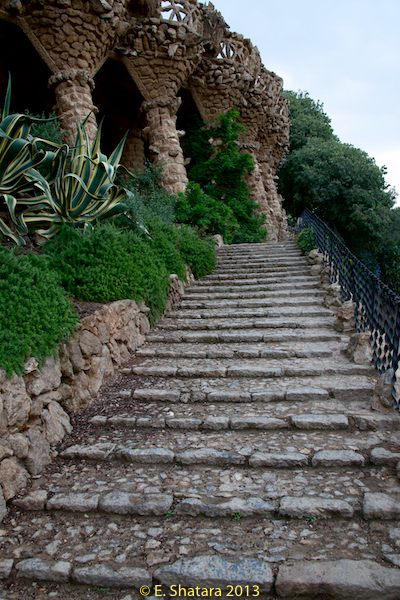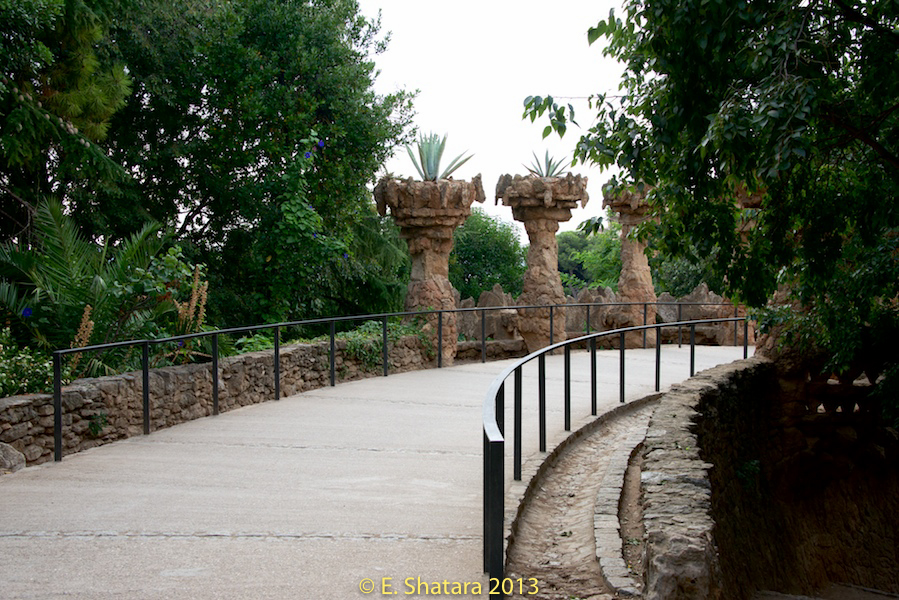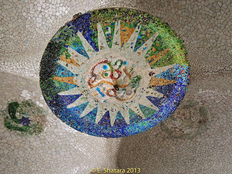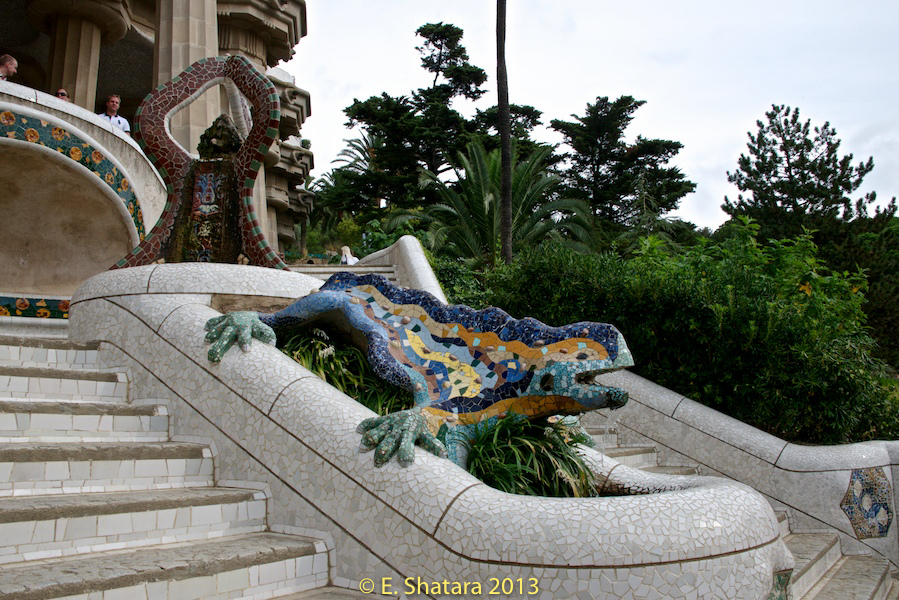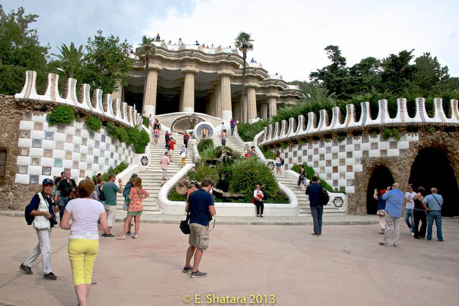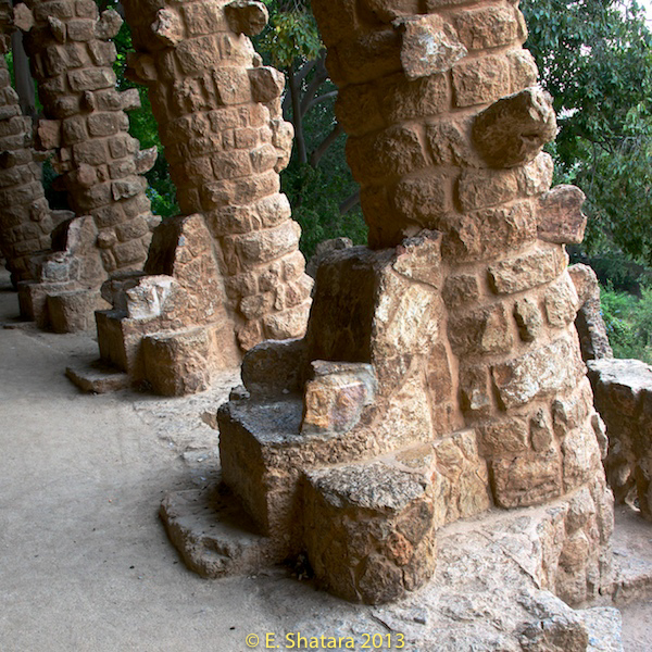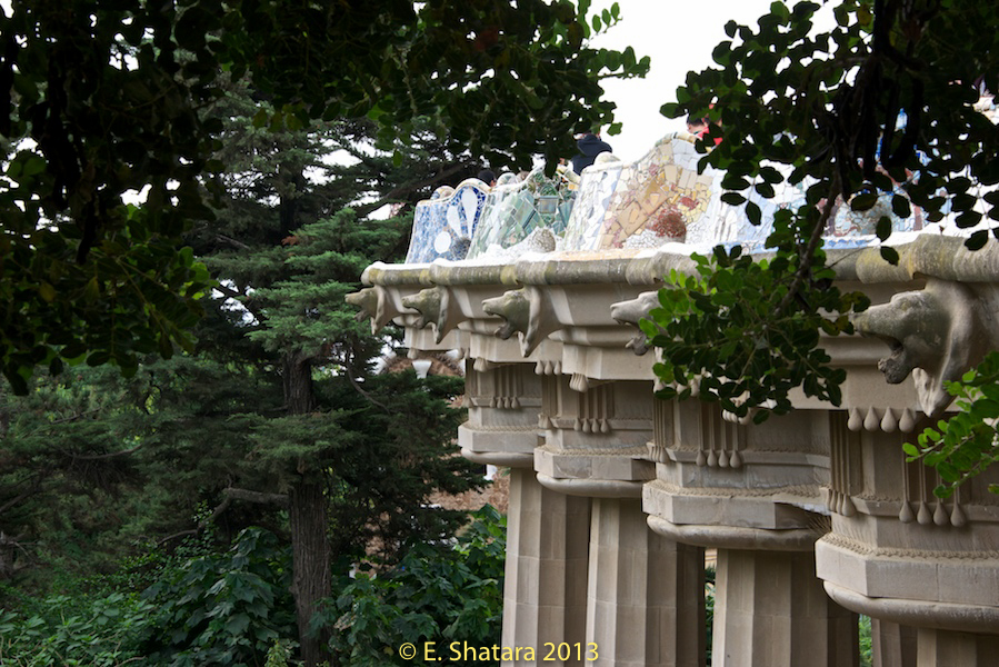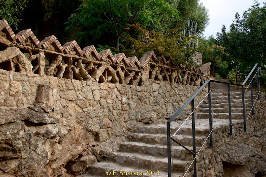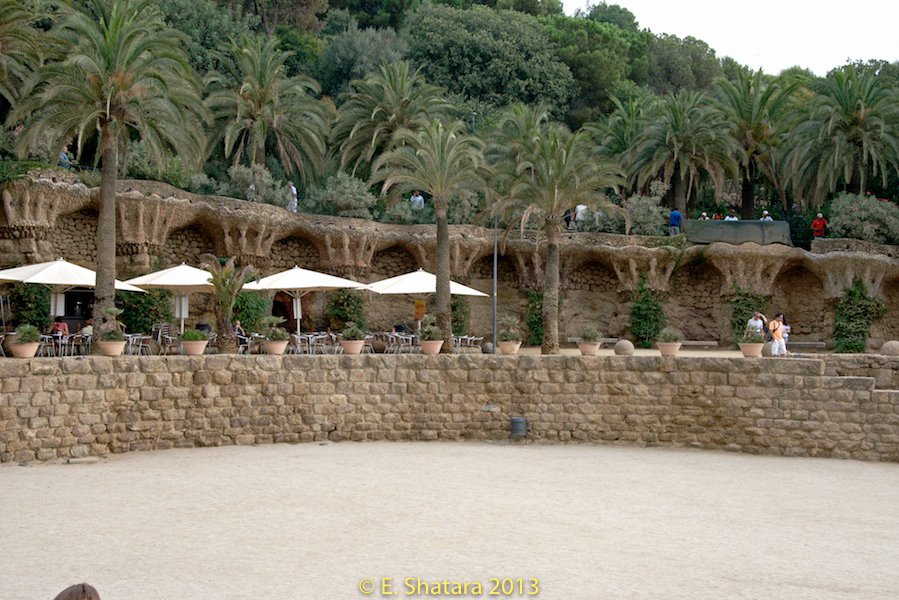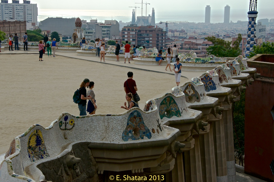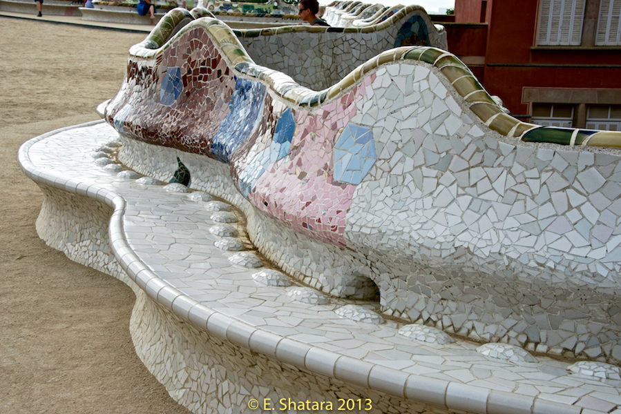 The unique shape of the serpentine bench enables the people sitting on it to converse privately, although the square is large. The bench is tiled and in order to dry up quickly after it rains, and to stop people from sitting in the wet part of the bench, small bumps were installed by Gaudi.