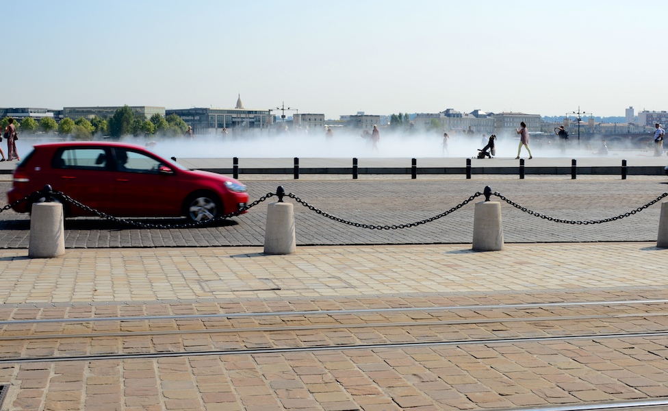 A mist of water emanating from the ground is both a piece of art as providing a method to cool people off.