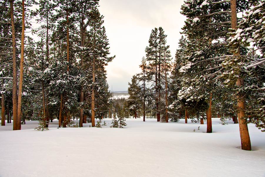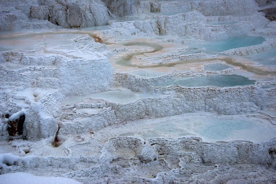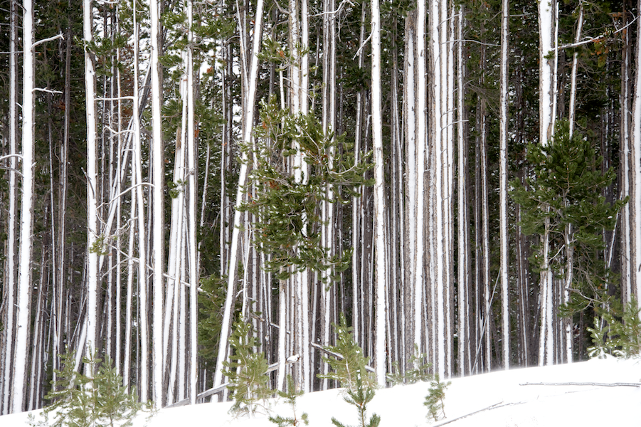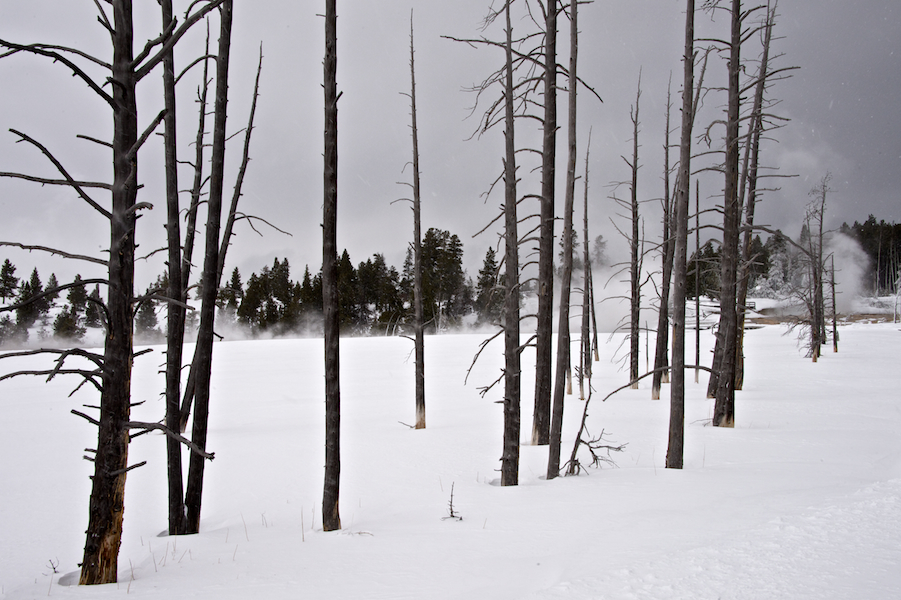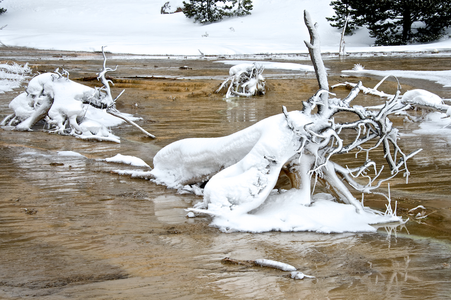 When they were alive, the runoff from nearby thermal features flooded the area around the trees. Minerals in the water plugged the base of the trees and killed them, leaving their bases white.