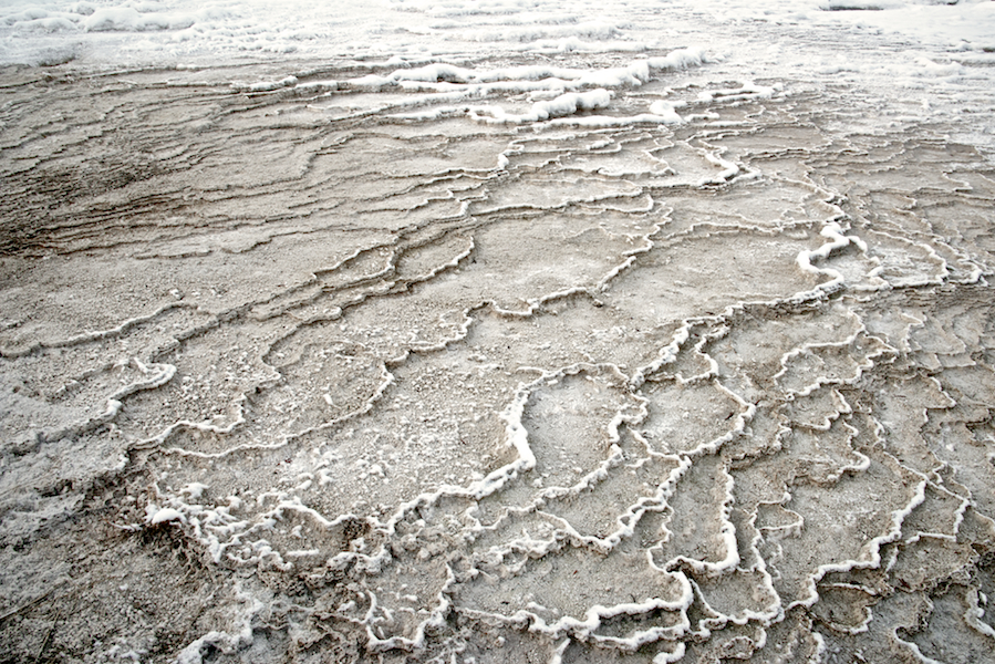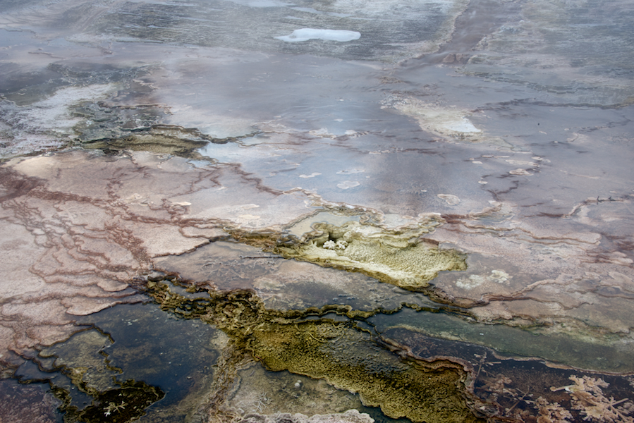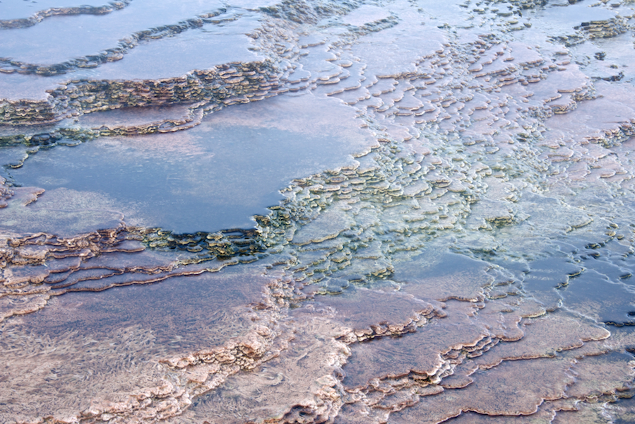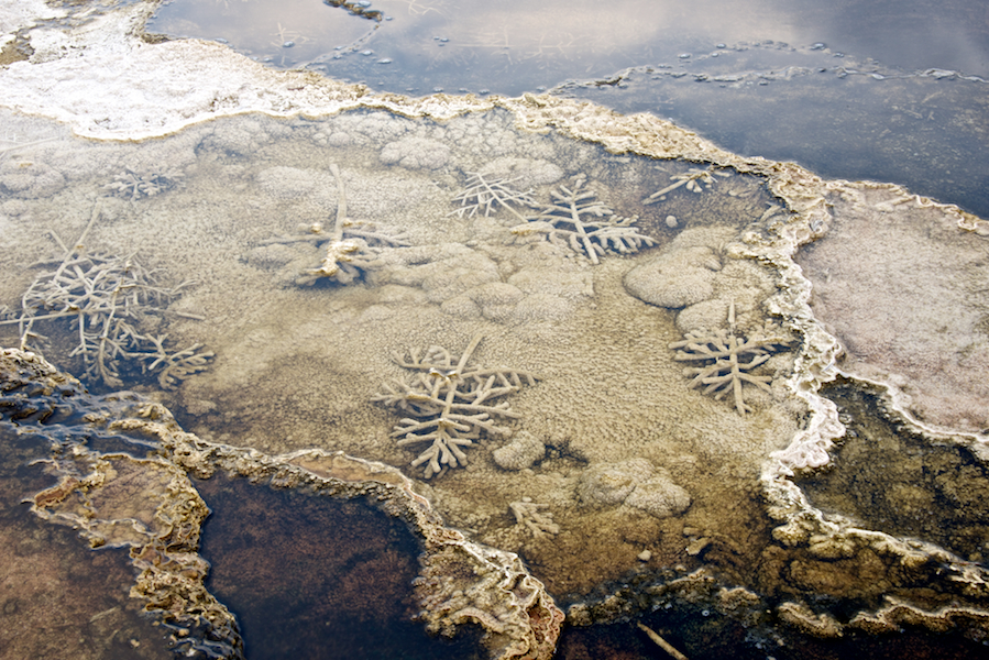 The patterns are formed by falling branches catching minerals and attracting bacteria in the mineral rich warm water.