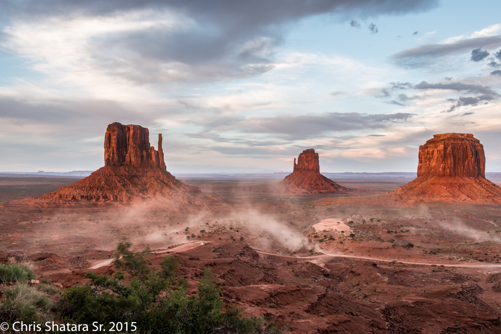Vehicles in the valley stirring up the dust.