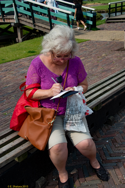 Tamara writing a post card to our grandson. Tamara made it a point to send him a post card or two from each town we visited .
