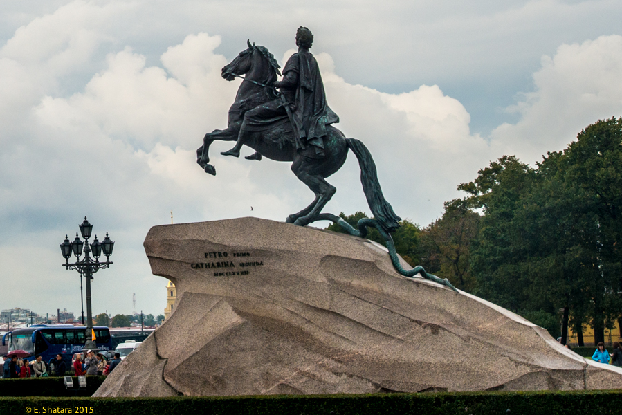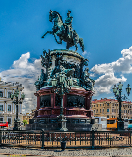 The Monument to Nicholas I, a bronze equestrian monument of Nicholas I of Russia on St Isaac's Square (in front of Saint Isaac's Cathedral). Unveiled in 1859, the six-meter statue was a technical wonder of its time. It was the first equestrian statue in Europe with only two support points (the rear hooves of the horse), the only precedent being the 1852 equestrian statue of U.S President Andrew Jackson.
