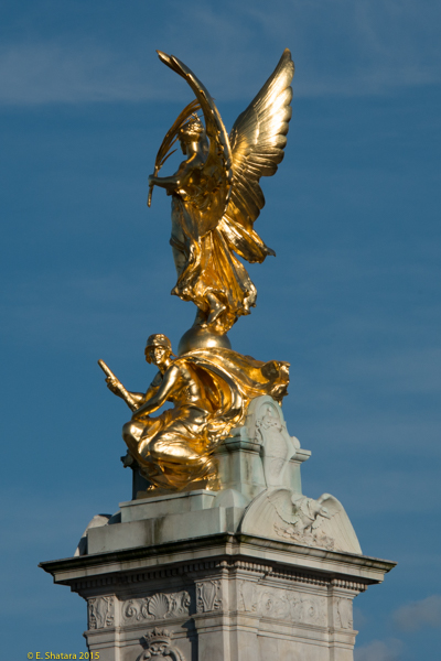 The stature on top of the Queen Victoria Memorial in front of Buckingham Palace