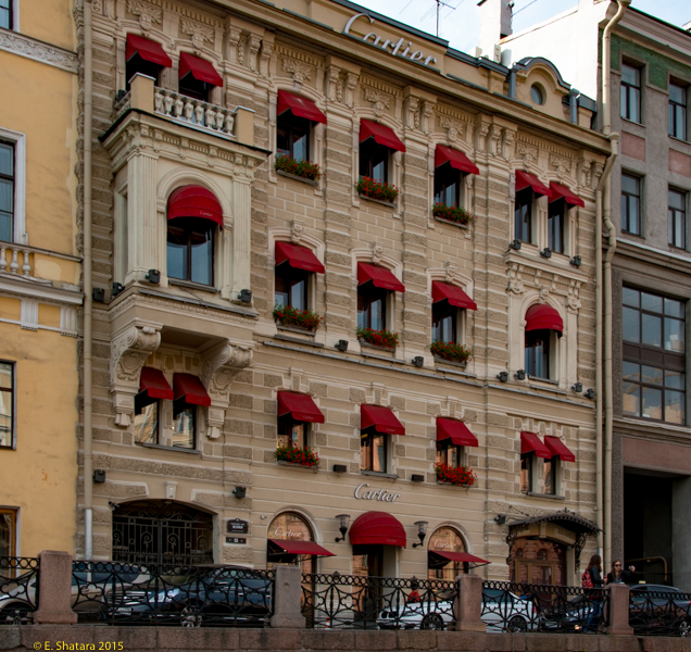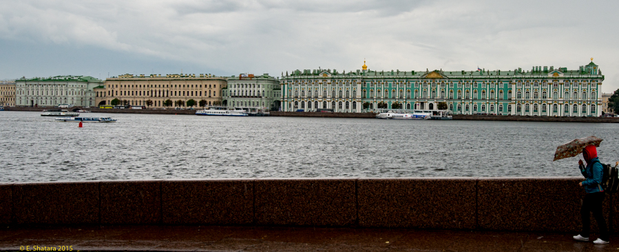 The Hermitage Museum is actually composed of five interconnected buildings shown here from left to right: Hermitage Theatre – Old Hermitage – Small Hermitage – Winter Palace (the "New Hermitage" is situated behind the Old Hermitage). The buildings were painted different colors as a means of identifying them before the use of numbers.
