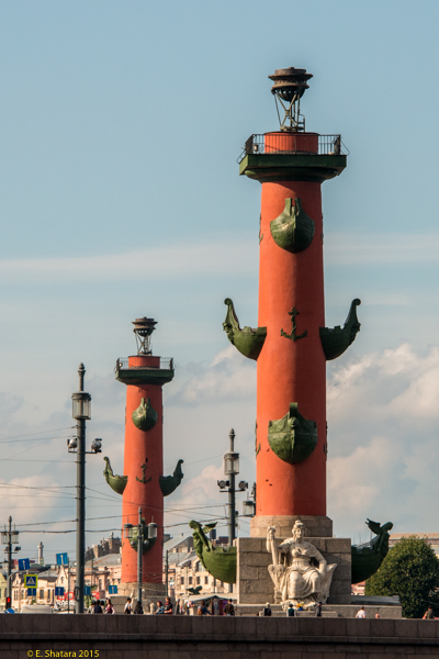 These two columns standing on Vasilyevsky Island are as much a symbol of St. Petersburg as the dome of St. Isaac's Cathedral, or the spire of the Ss. Peter and Paul Cathedral. For over two centuries, they have formed an integral part of the city's central panorama over the River Neva, and are particularly impressive on major public holidays, when torches are lit on top of them.