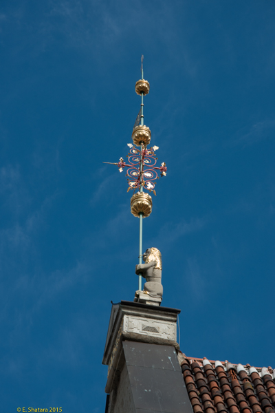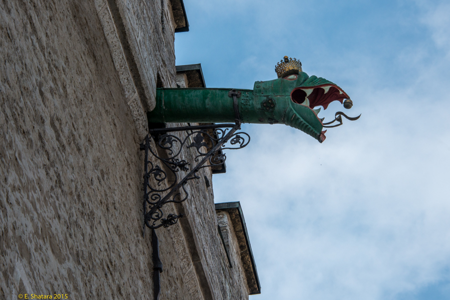 The down spouts from the roof of the town hall Made to look like a dragon's head.