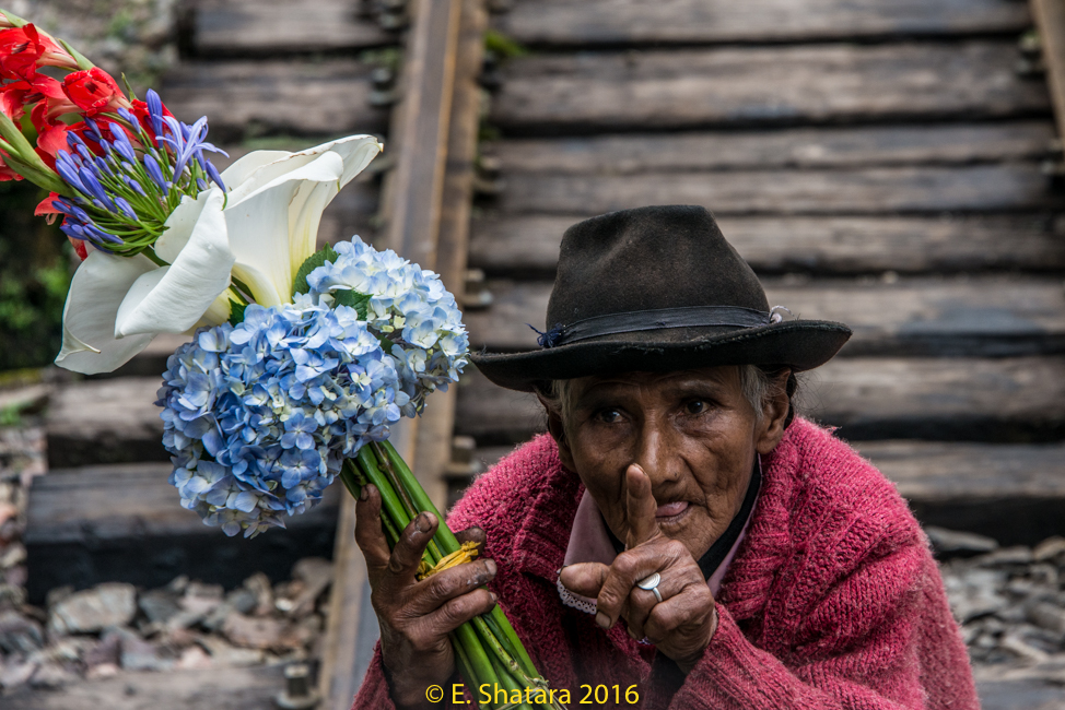 Our train had stopped to allow an oncoming train to pass. While we were there this woman was trying to sell us flowers. Unfortunately she couldn't get on the train. No sale today.