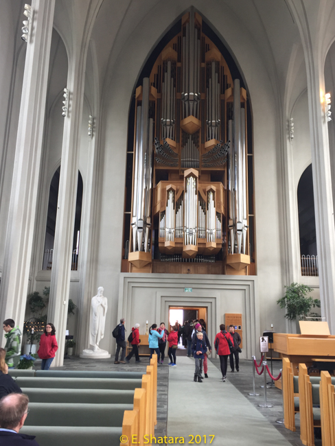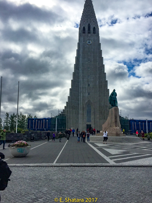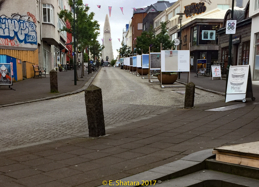 The shopping area in Reykjavik. at the top of the street is the Hallgrimskirkja, a Luthern Church standing 244 feet high.