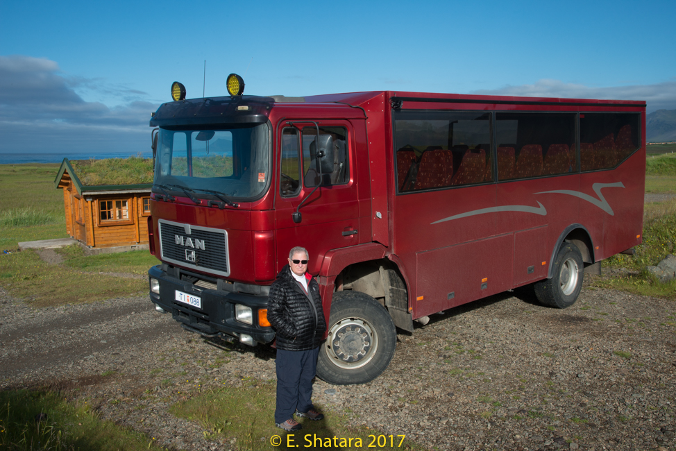 Tom standing in front of our bus. Basically a bus shell attached to a flatbed truck. No suspension!