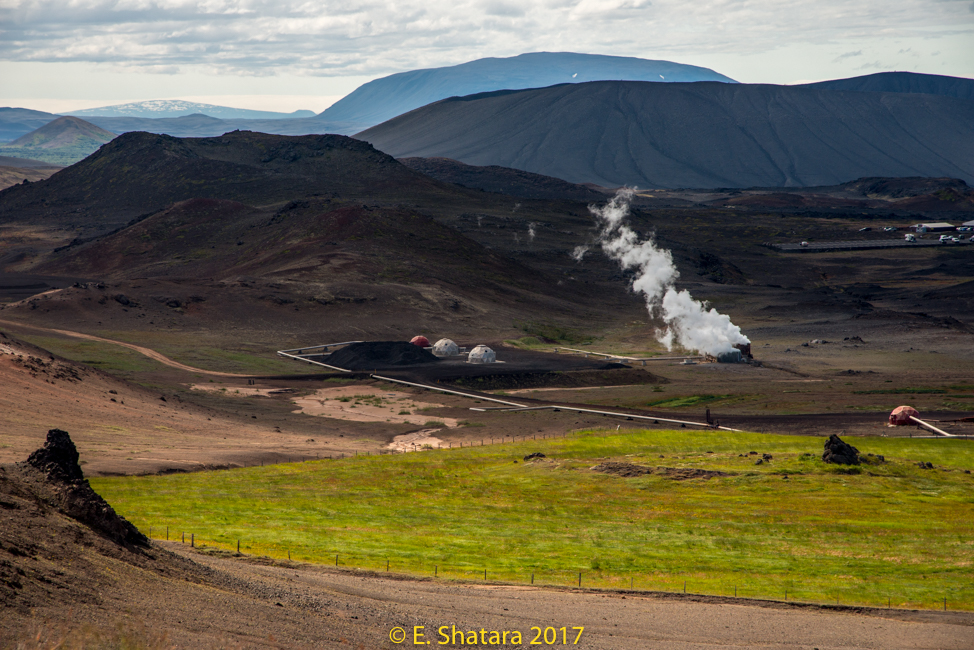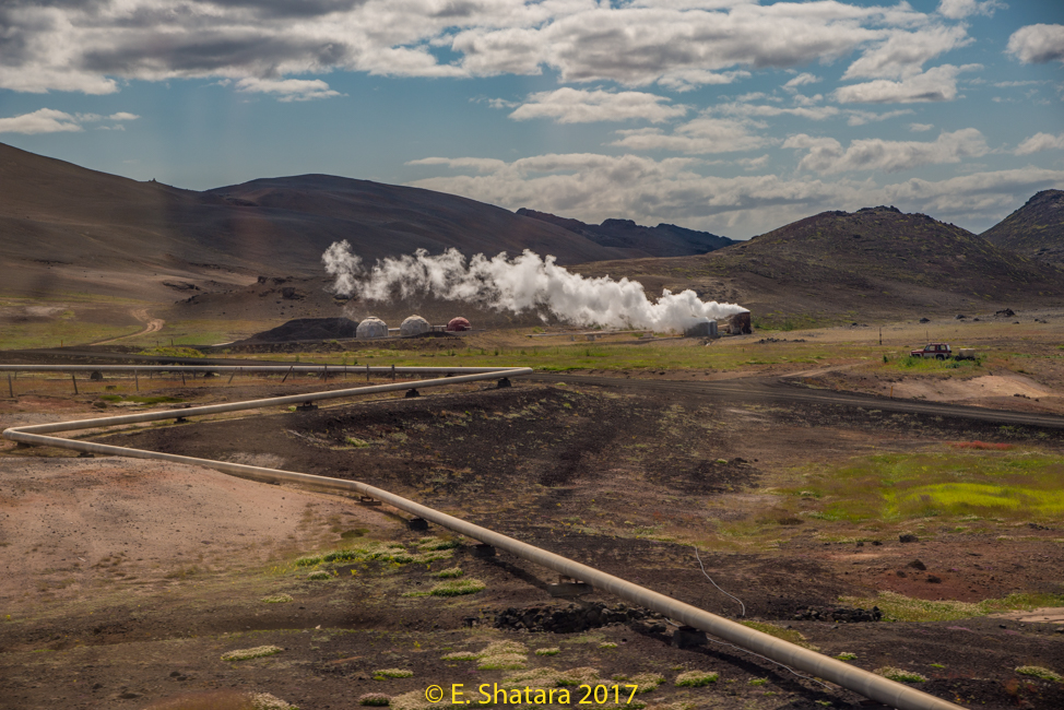 Pipelines bring boiling hot water to from boreholes to the power plants near Lake Myvatn