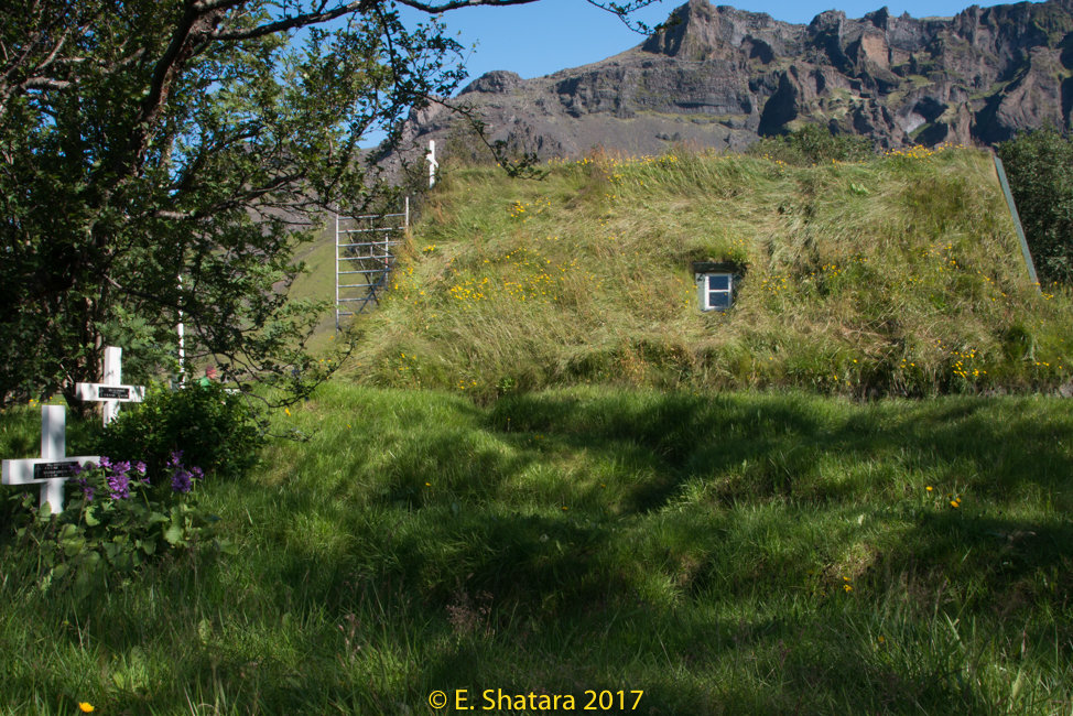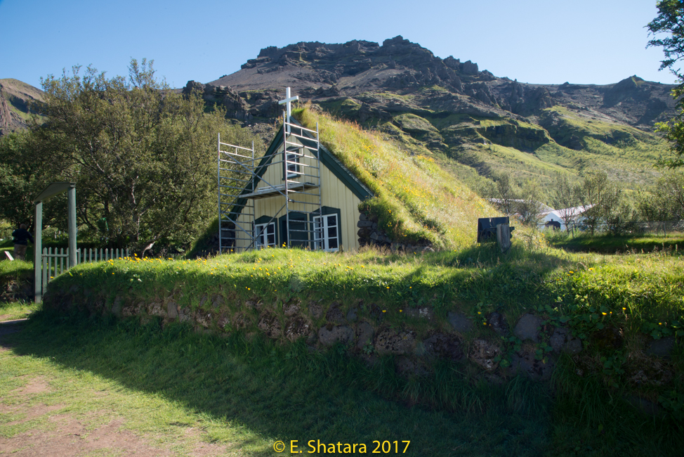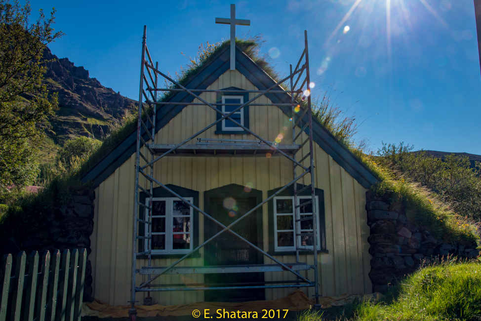 The Black Church is black because the exterior wood is painted with pitch, just like the hull of a boat. This is to protect it from the harsh Icelandic elements. This works fairly well and buildings treated in this way have survived over 100 years.