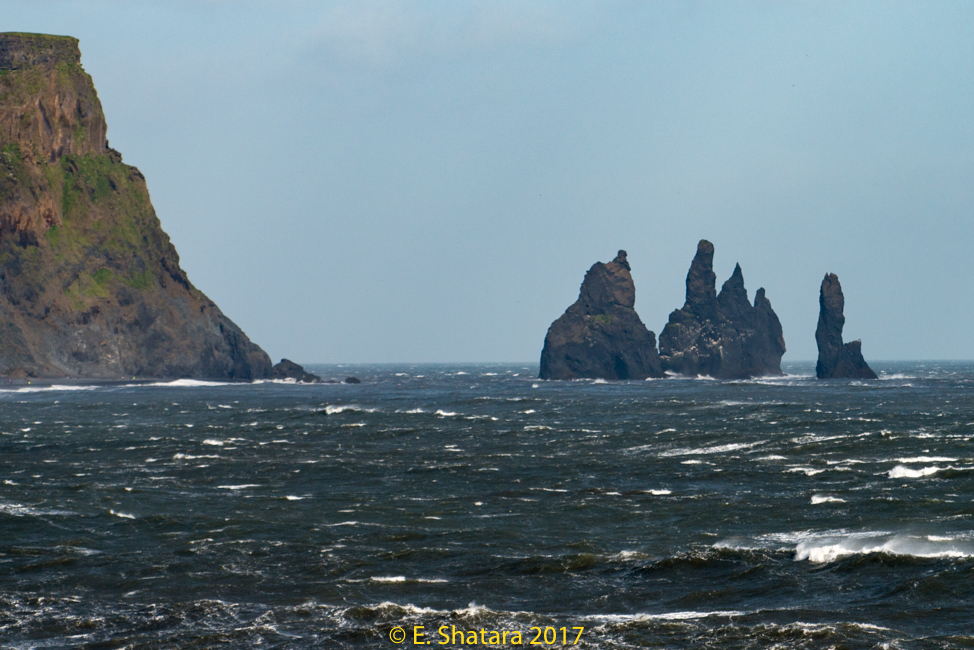 Reynisdrangar are basalt sea stacks situated off the black sand beach near the village Vík
