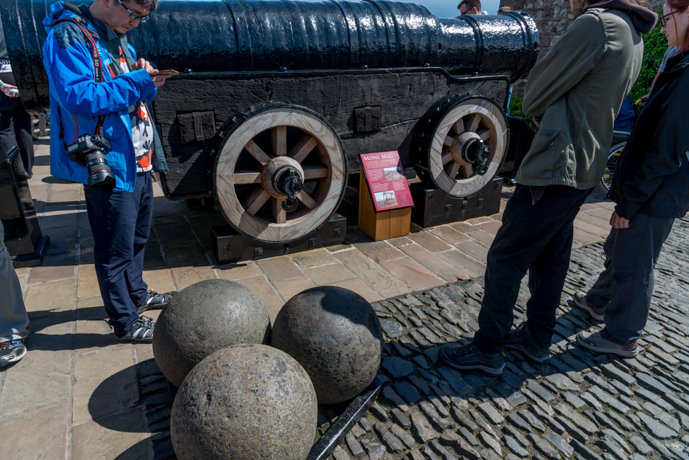 The cannonballs used by Mons Meg, a medieval cannon pictured in the back.