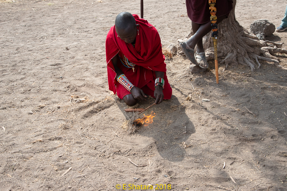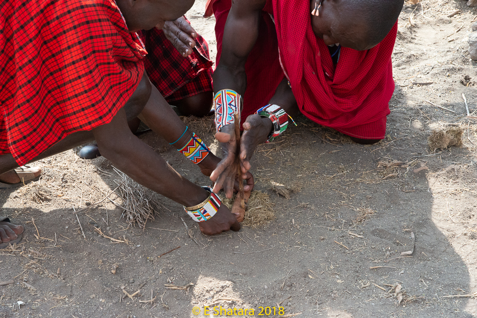 A flat piece of wood with a hole in it is placed over dry elephant dung and then a round stick is inserted in the hole and spun quickly between the palms of his hand until smoke and then fire erupts.