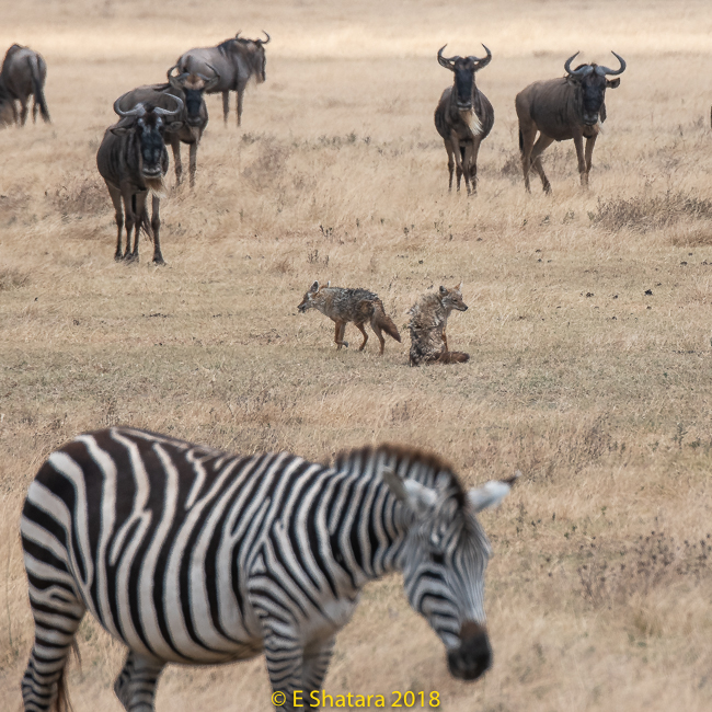 Jackals in the midst of wildebeest and zebra. They ignored them.