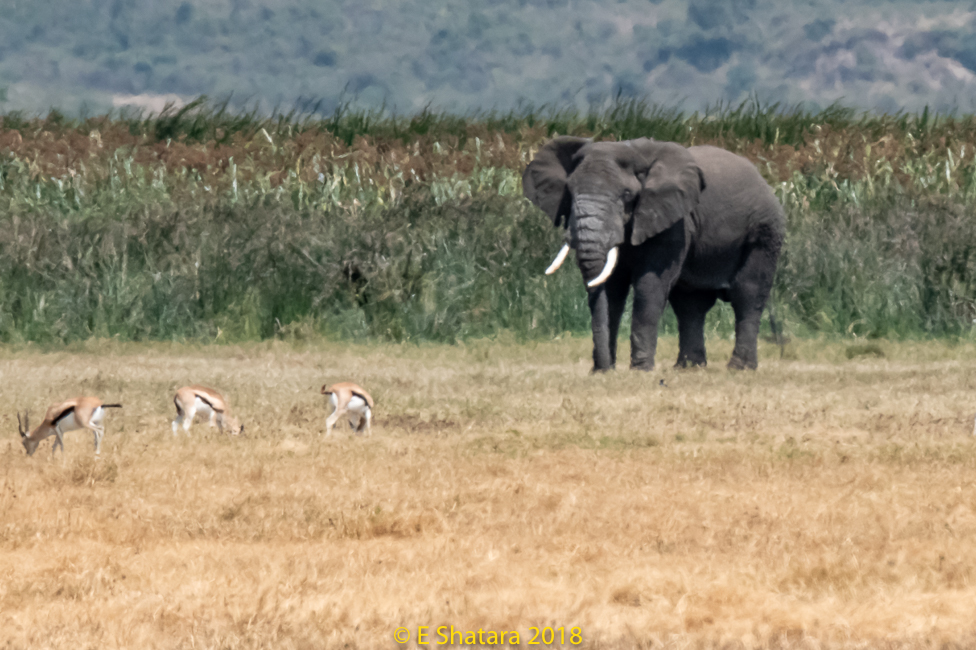 Thompson Gazelle with an elephant watching over them.
