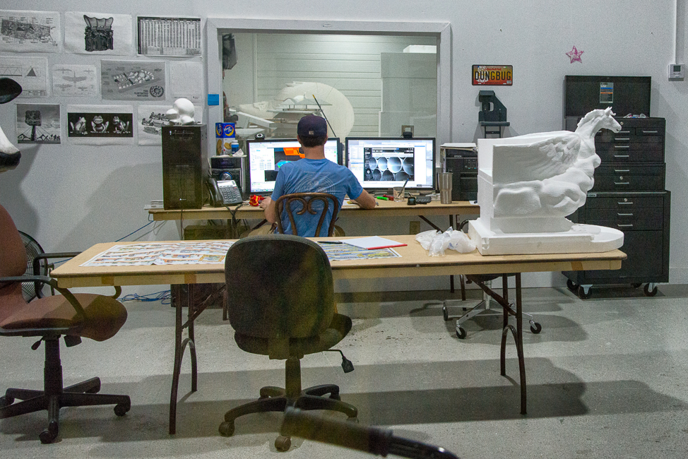 For intricate designs, a CNC machine is used to carve the statue out of foam.